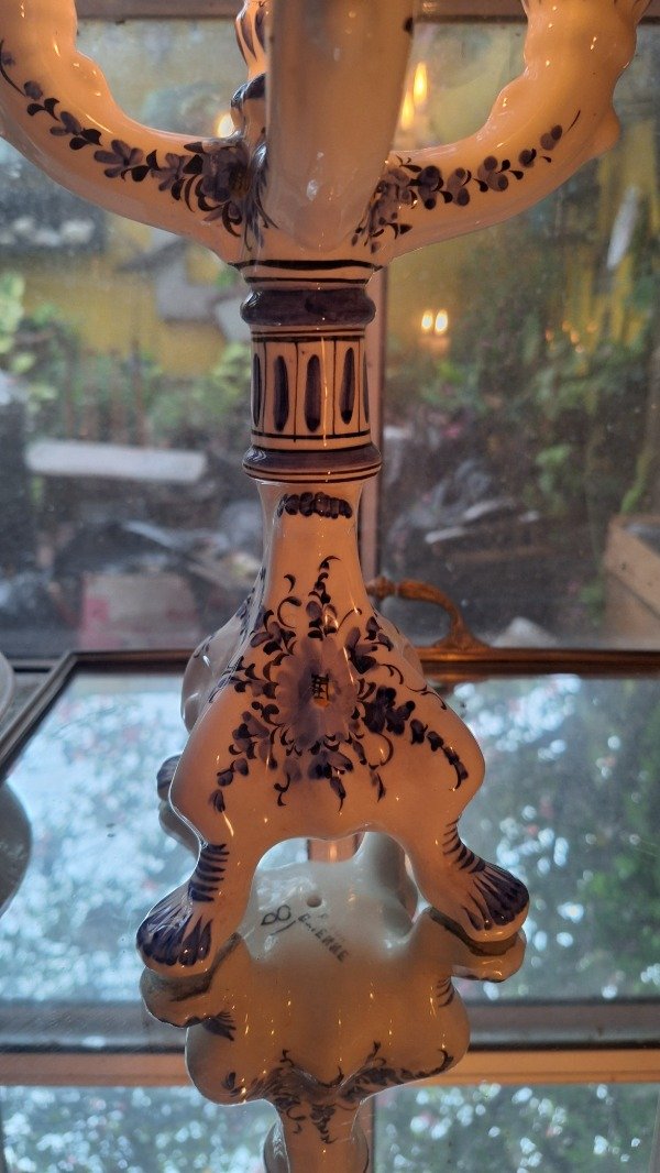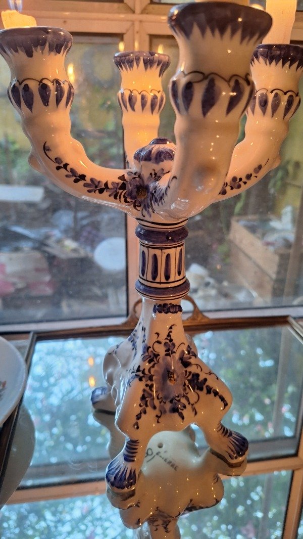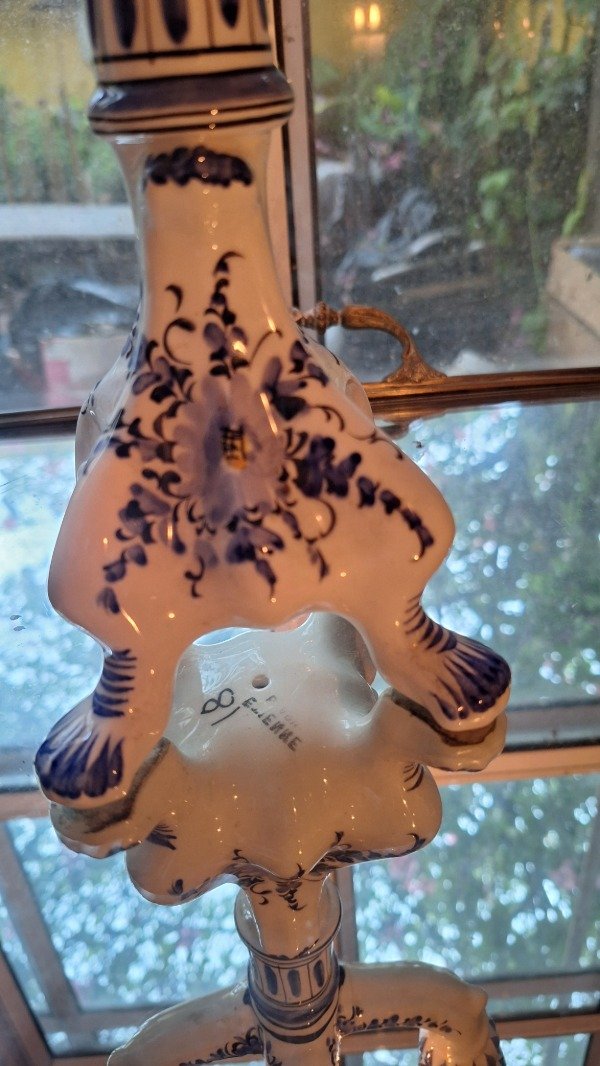 Candelabro de ceramica estilo talavera para 4 velas con sello Etienne. 25,5cm de altura y 18cm de diámetro