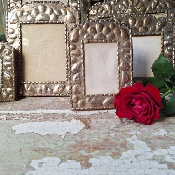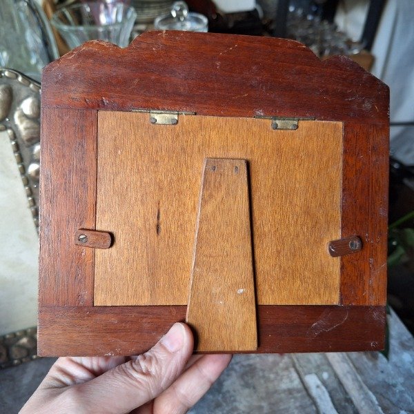 Portarretrato de metal repujado sobre base de madera noble. 17cm de altura x 18cm de ancho para fotos de 13cm x 10cm