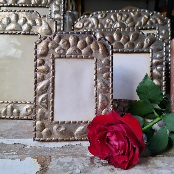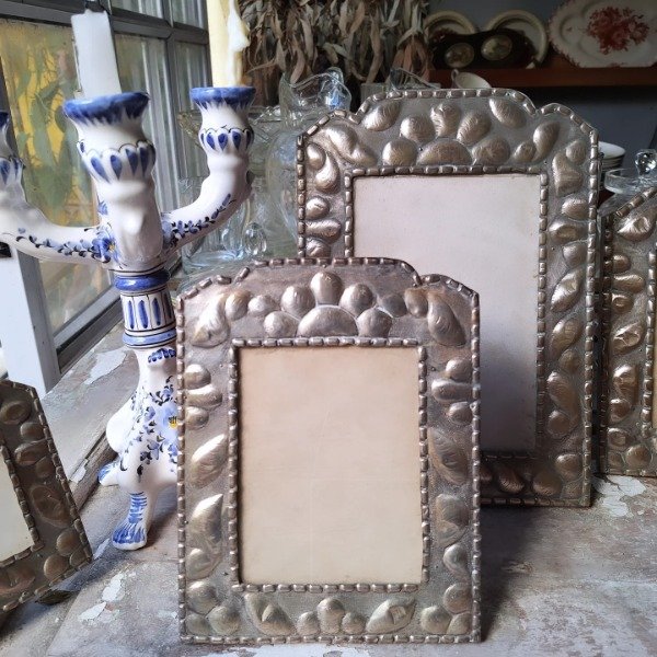 Portarretratos de metal repujado sobre base de madera noble. 16cm de altura x 11,5cm de ancho para fotos de 10cm x 7cm. El precio es por cada uno