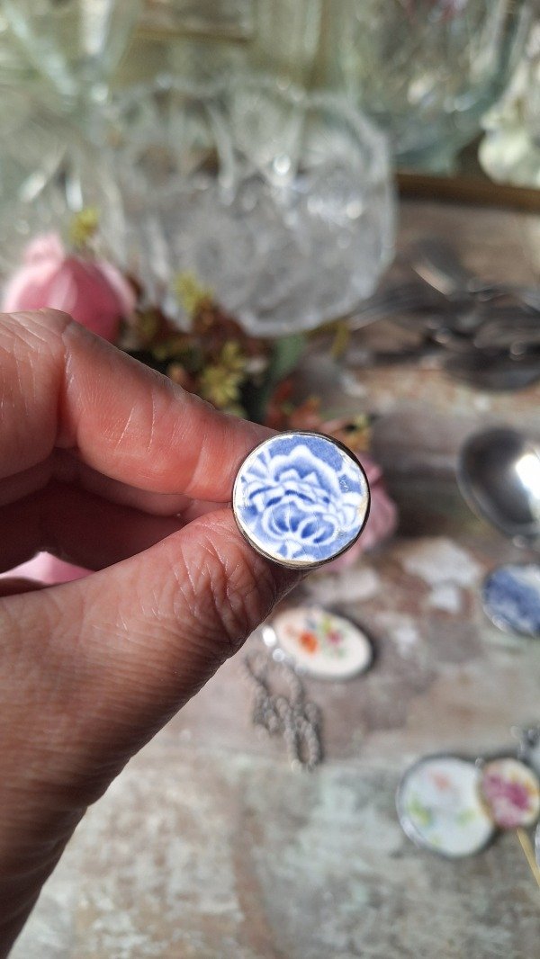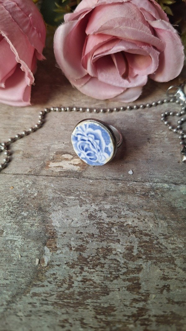 Anillo de loza inglesa con detalles en azul claro sobre base regulable de acero
