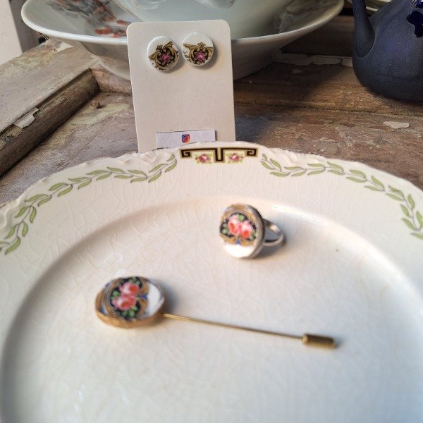 Anillo con base de acero regulable con dije de loza inglesa con flores