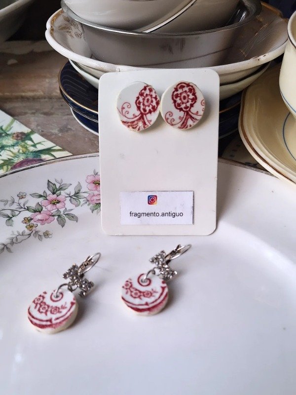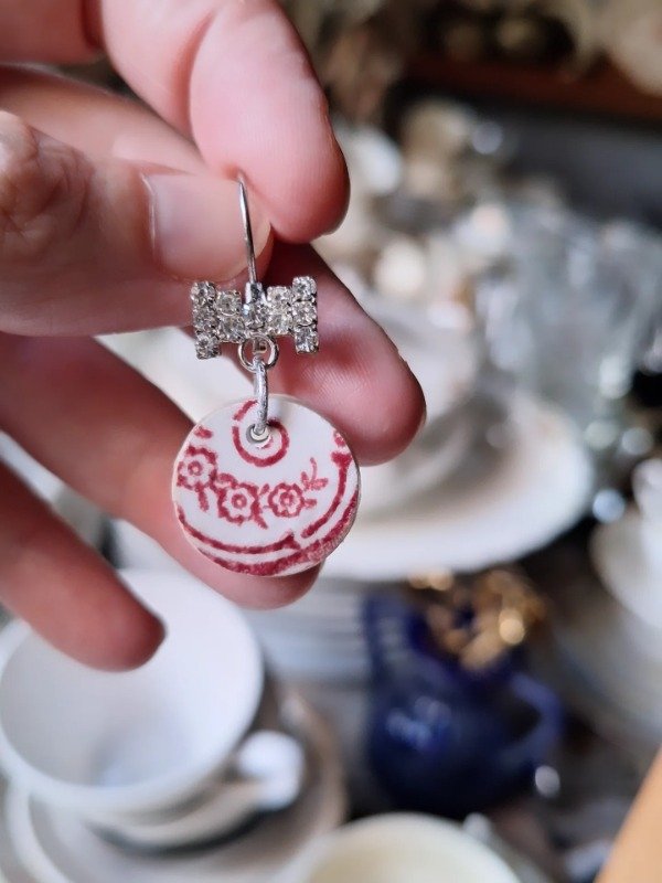 Par de aros con pasante de acero, moño de strass y loza inglesa monocromática roja.