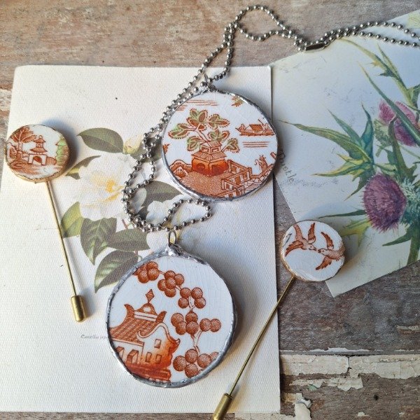 Prendedor con recorte de loza inglesa con diseño de aves wilow