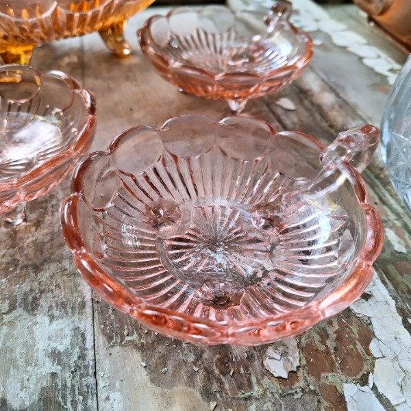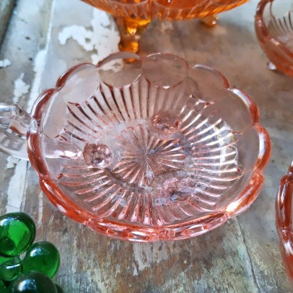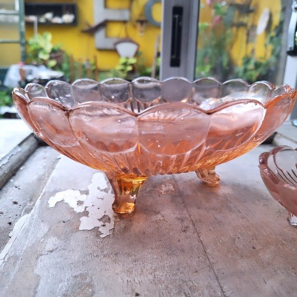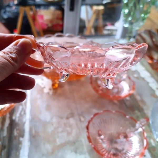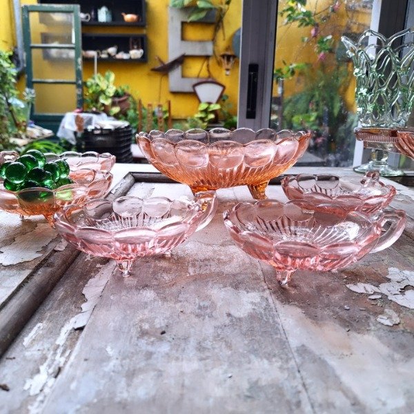 Juego de bowl y 5 compoteras de vidrio prensado rosa francés Vallerysthall. Cada pieza tiene patitas de apoyo. El bowl tiene 31cm de diámetro y 7,5cm de altura con las patitas incluidas. Las compoteras tienen 11cm de diámetro y 4,5cm de altura. El precio es por las 6 piezas