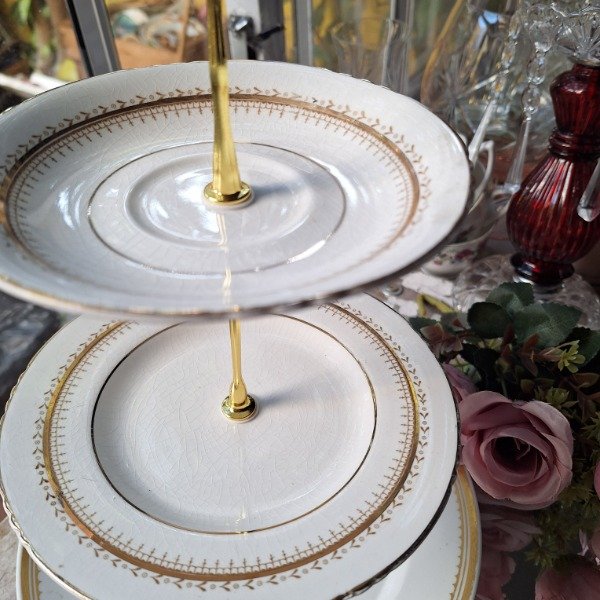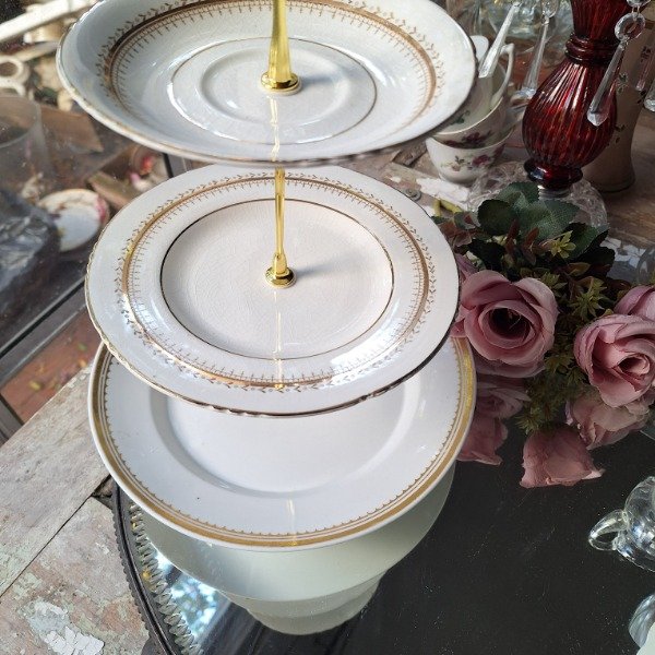 Masitero de tres niveles compuesto por playo de porcelana alemana + plato de postre y de té de procedencia inglesa.