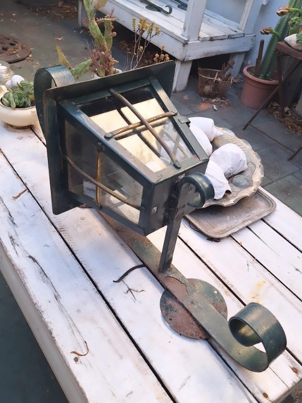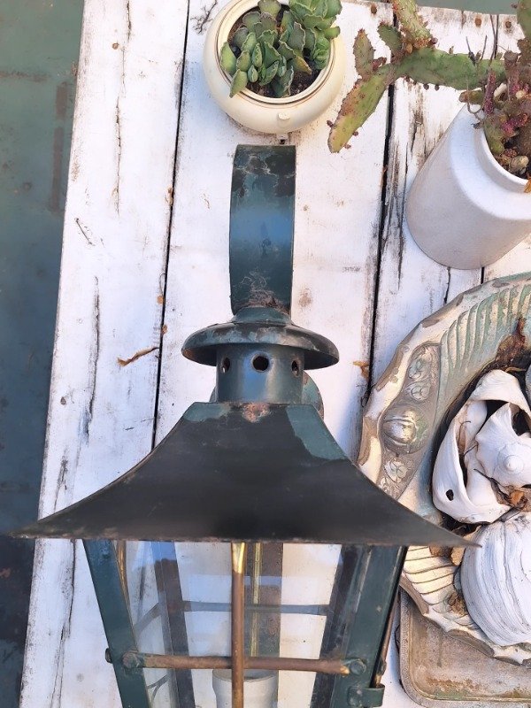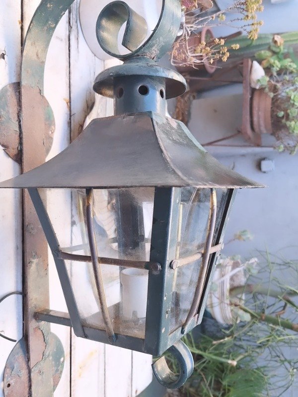 Farol de metal. 63cm de largo y 15cm de lado. Con desgaste de la pintura