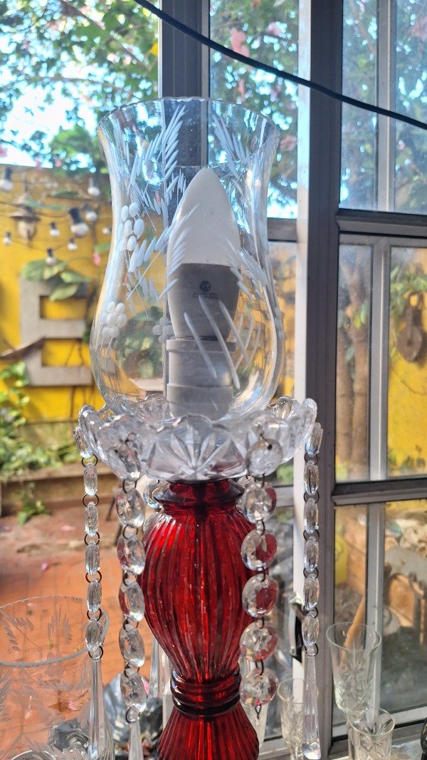 Lámpara de mesa con tulipa tallada, caireles y cuerpo de vidrio. 65cm de altura. Cableada a nuevo