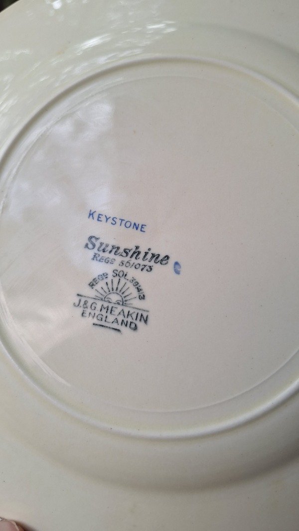 Platos de postre o entrada Sunshine de J & G Meakin modelo Keystone. 19cm de diámetro. Algunas piezas presentan craquel acorde a su antigüedad El precio es por cada uno.