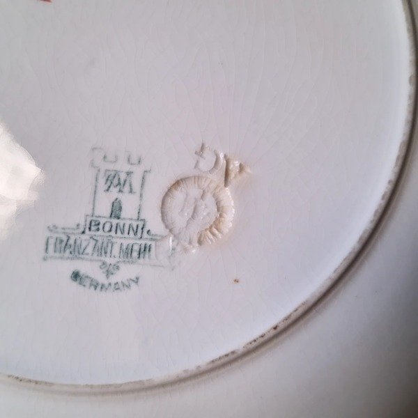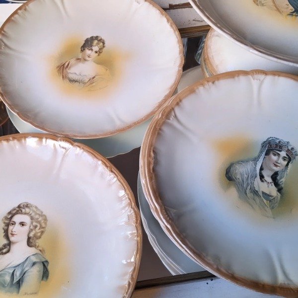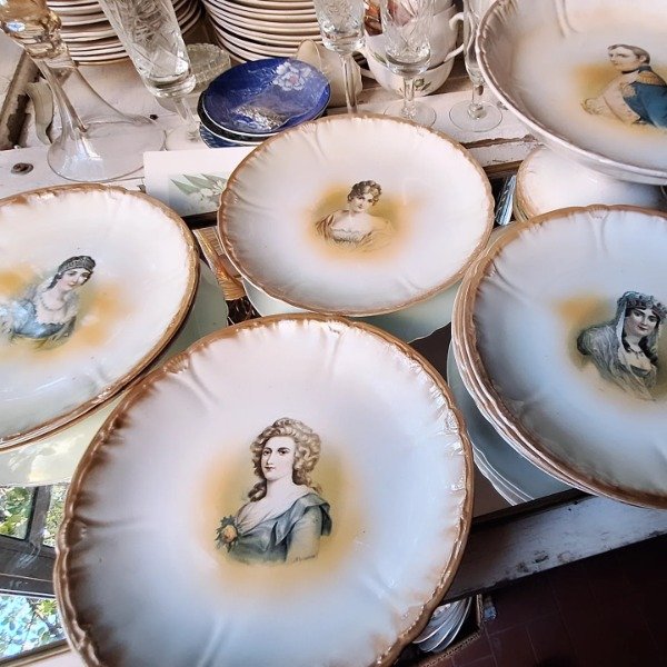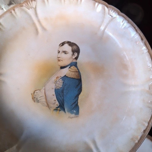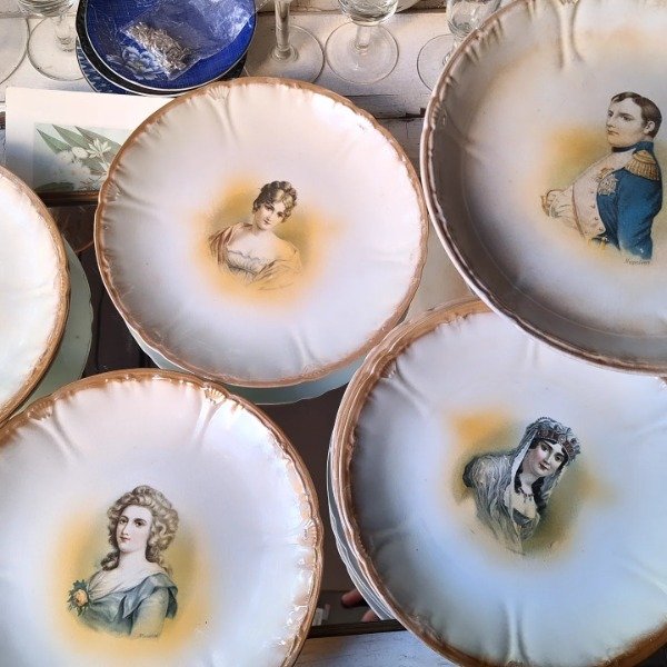 Juego para masas de loza alemana Franz Anton Mehlem compuesto por masitero con pie de 24cm de diámetro y 12,5cm de altura y 8 platos de 21,5cm. Su diseño destaca por poseer a Napoleón y 4 figuras femeninas destacadas de su época: Josefina, Hortensia, María Luisa y Madame Recamier. Todo en muy buenas condiciones y con craquel acorde a su antigüedad.