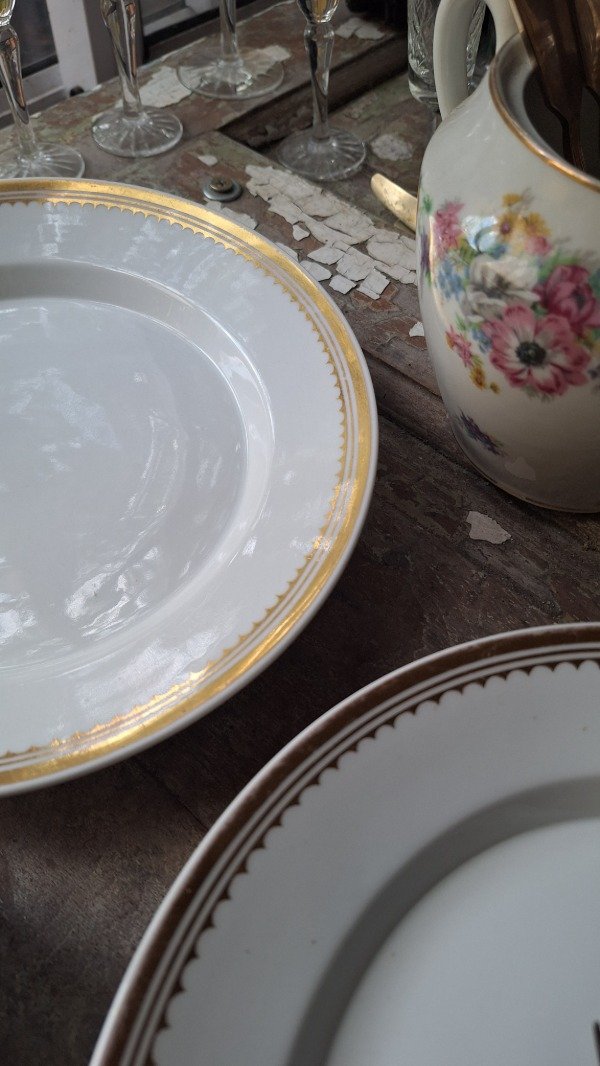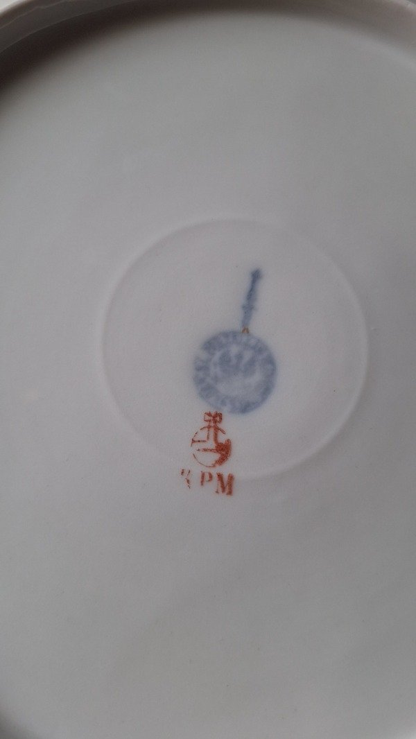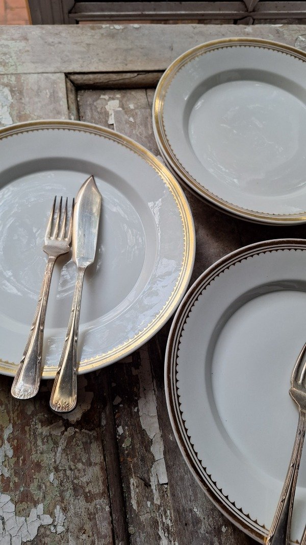 6 platos playos de porcelana alemana KPM con guarda en dorado. 23cm de diámetro. El precio es por los 6